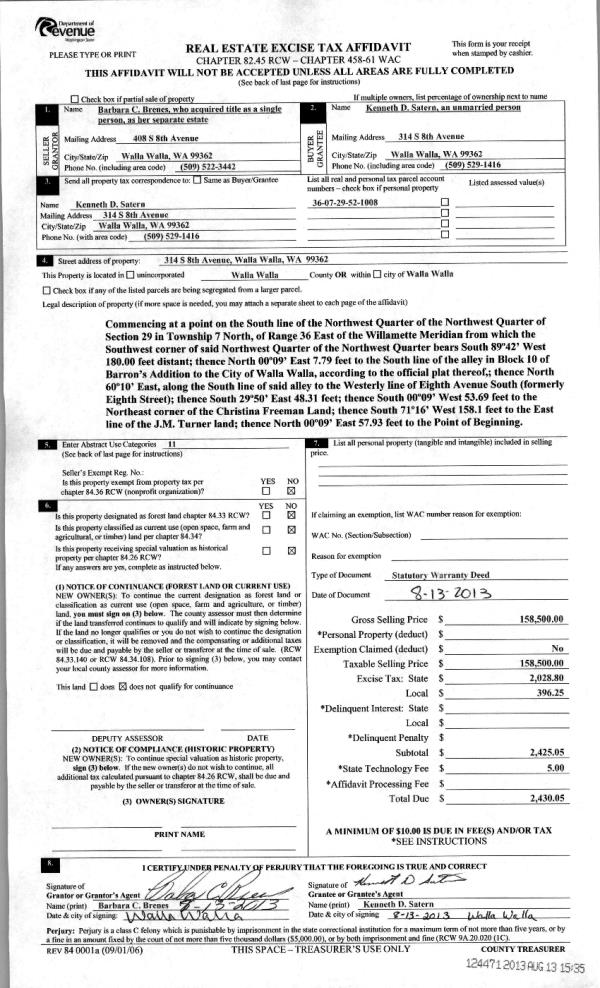 | 5 | 08/13/2013 | WARRANTY D | WARRANTY DEED | BRENES, BARBARA C | SATERN, KENNETH D | | | $158,500.00 | 124471 | 2013-08258 |