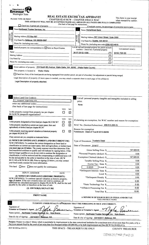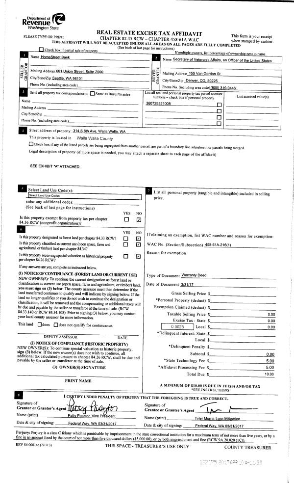 | 3 | 03/31/2017 | WARRANTY D | WARRANTY DEED | HOMESTREET BANK | SECRETARY OF VETERANS AFFAIRS | | | $0.00 | 132175 | 2017-02681 |