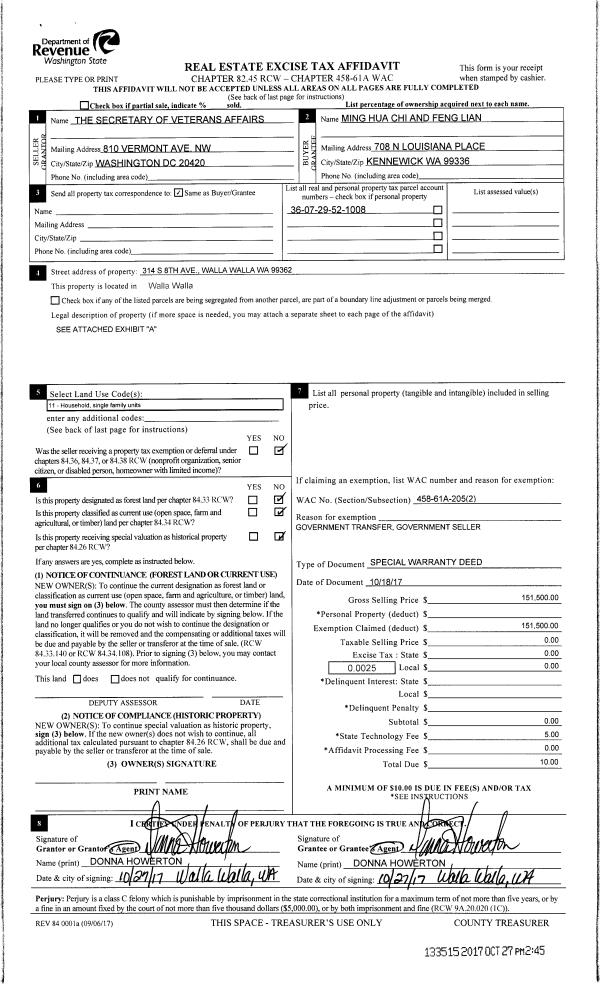 | 2 | 10/27/2017 | SWP | Special Warranty Deed | SECRETARY OF VETERANS AFFAIRS | CHI MING HUA & FENG LIAN | | | $151,500.00 | 133515 | 2017-08637 |