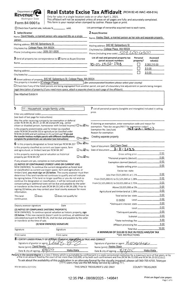 | 1 | 08/08/2025 | QCD | QUIT CLAIM DEED | NEWBY DAVID | STACK KELSEY | | | | 149841 | 2025-04706 |