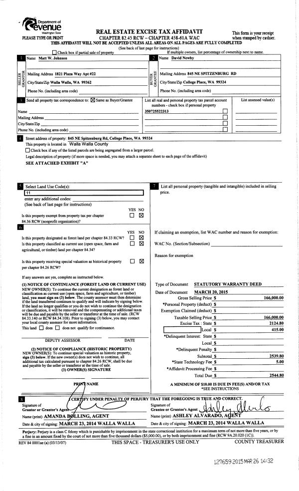 | 2 | 03/26/2015 | SWD | STATUTORY WARRANTY DEED | JOHNSON MATT W | NEWBY DAVID | | | $166,000.00 | 127659 | 2015-02478 |