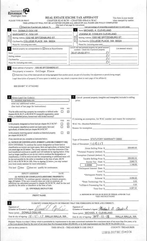 | 1 | 12/15/2017 | SWD | STATUTORY WARRANTY DEED | OGILVIE DONALD & MARGARET | CLEVELAND MICHAEL A & JOANNA M COWLES | | | $229,900.00 | 133816 | 2017-10128 |