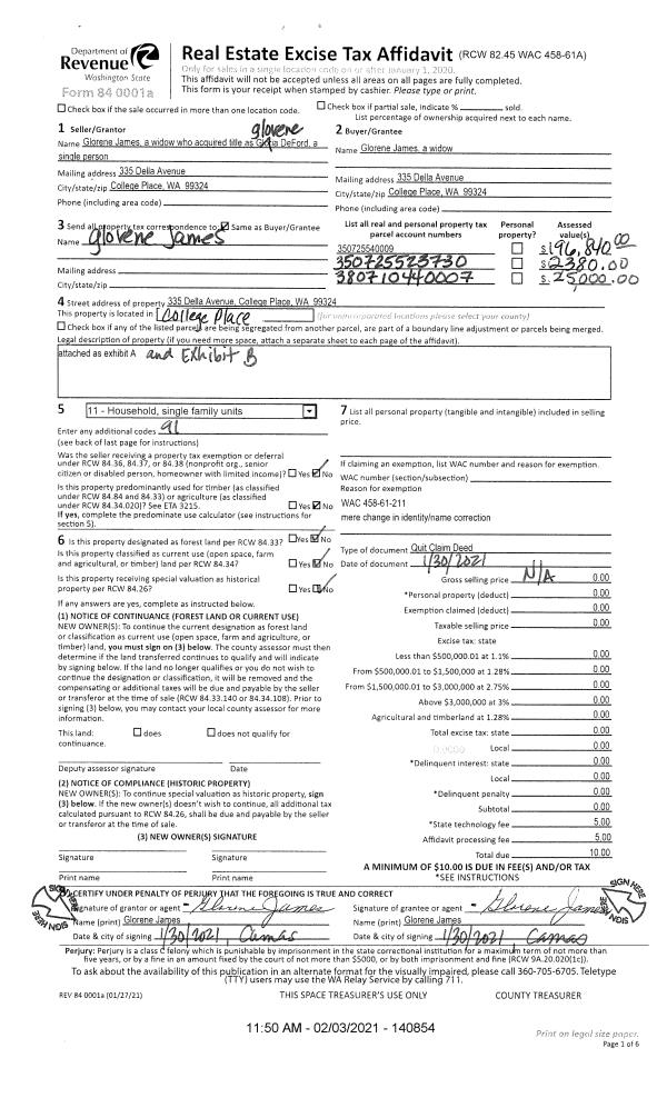 | 2 | 01/30/2021 | QCD | QUIT CLAIM DEED | DE FORD GLORENE K | JAMES GLORENE ESTATE OF | | 3 PARCELS | $0.00 | 140854 | 2021-01347 |
