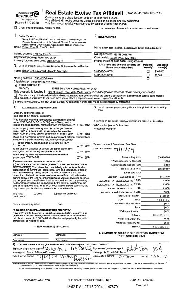 | 1 | 07/15/2024 | BARGAIN & | BARGAIN & SALE DEED | JAMES GLORENE ESTATE OF | TAYLOR ROBERT SETH & ELIZABETH ANN | | 2-PARCELS | $365,000.00 | 147870 | 2024-03816 |