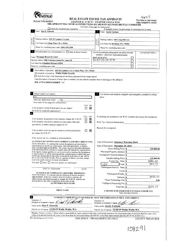 | 1 | 12/20/2019 | SWD | STATUTORY WARRANTY DEED | SCHWEHR DON P | YOCHUM JUSTIN | | 2-PARCLES | $225,500.00 | 138291 | 2019-10586 |