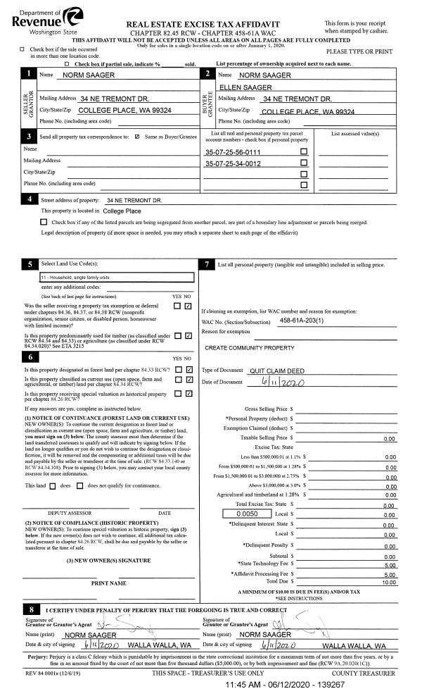 | 1 | 06/11/2020 | QCD | QUIT CLAIM DEED | SAAGER NORM | SAAGER NORM & ELLEN | | | $0.00 | 139267 | 2020-05314 |