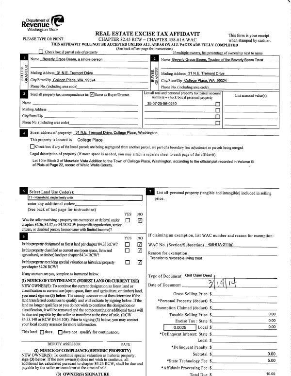 | Mailing Address: | BEVERLY GRACE BEEM TRUSTEE 31 NE TREMONT DR COLLEGE PLACE, WA 99324 | % Ownership: | 100.0000000000% |
