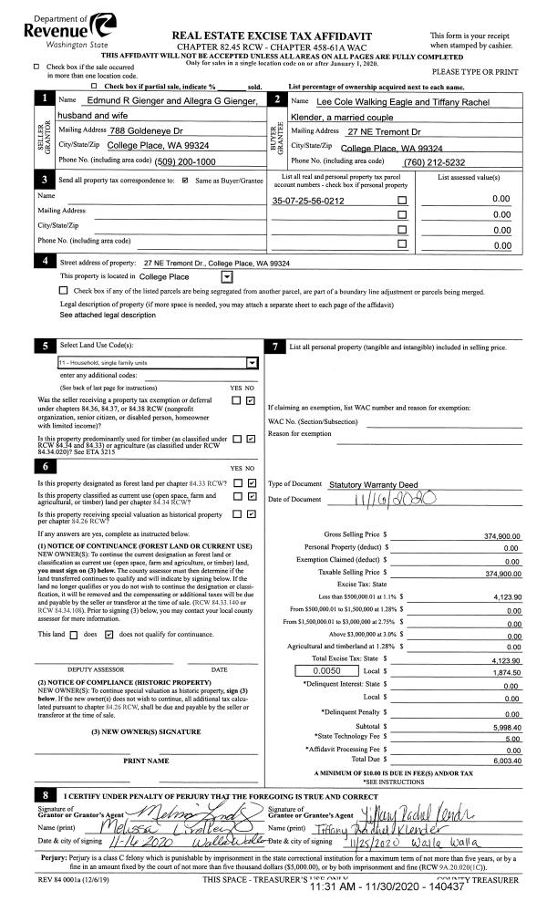 | 1 | 11/30/2020 | SWD | STATUTORY WARRANTY DEED | GIENGER EDMOND R & ALLEGRA G | WALKING EAGLE LEE COLE | | | $374,900.00 | 140437 | 2020-12555 |