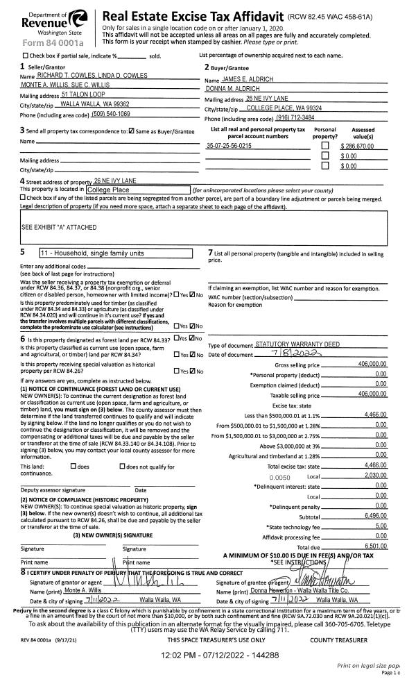 | 1 | 07/12/2022 | SWD | STATUTORY WARRANTY DEED | COWLES RICHARD T & LINDA D | ALDRICH JAMES E & DONNA M | | | $406,000.00 | 144288 | 2022-05898 |