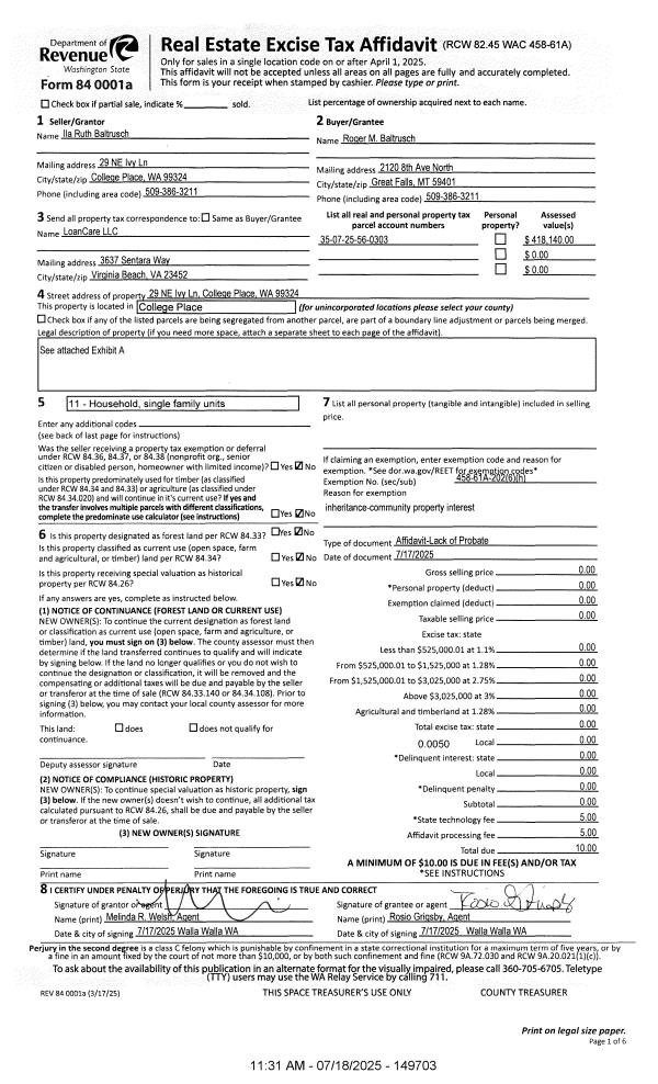 | 2 | 07/18/2025 | LOPA | LACK OF PROBATE AFFIDAVIT | BALTRUSCH ROGER M & ILA R | BALTRUSCH ROGER M | | | | 149703 | 2025-04135 |