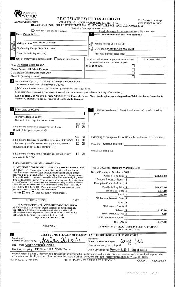 | 1 | 10/04/2019 | SWD | STATUTORY WARRANTY DEED | FRY CARY S & PAMELA S | HAMMOND WILLIAM & HOPE | | | $250,000.00 | 137817 | 2019-07919 |