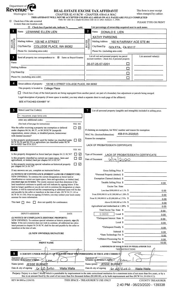 | 3 | 06/23/2020 | DEATH CERT | DEATH CERTIFICATE | LIEN DONALD E & LEWANNE ESTATE OF | LIEN DONALD E ESTATE OF | | | $0.00 | 139338 | 2020-05781 |