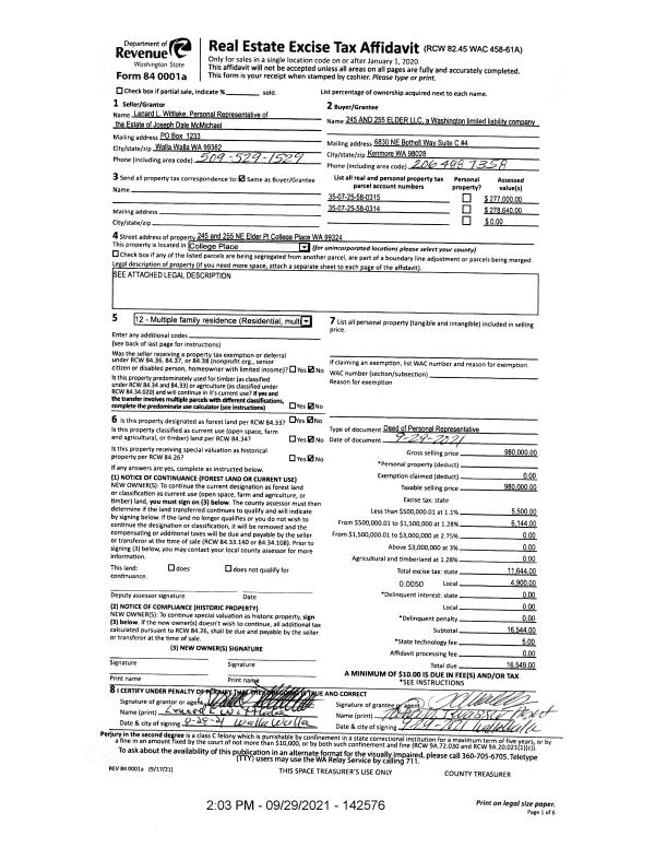 | 1 | 09/29/2021 | DPR | DEED OF PERSONAL REPRESENTATIVE | MC MICHAEL JOSEPH D ESTATE OF | 245 AND 255 ELDER LLC | | 2-PARCELS | $980,000.00 | 142576 | 2021-11919 |