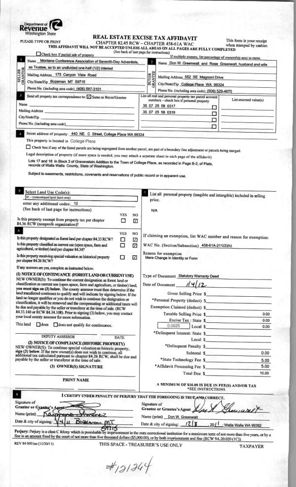 | 3 | 01/11/2012 | WARRANTY D | WARRANTY DEED | MONTANA CONF ASSOC OF SDA | GREENWALT, DON W & ROSE | | | | 121264 | 2012-00333 |