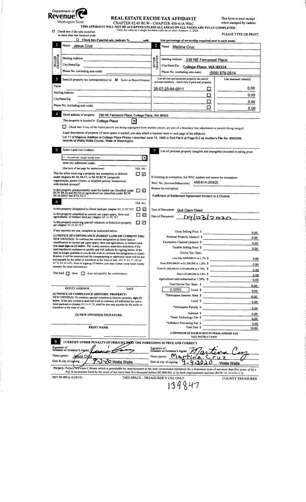 | 1 | 09/16/2020 | QCD | QUIT CLAIM DEED | CRUZ JESUS & MARTINA | CRUZ MARTINA | | | | 139847 | 2020-08980 |
