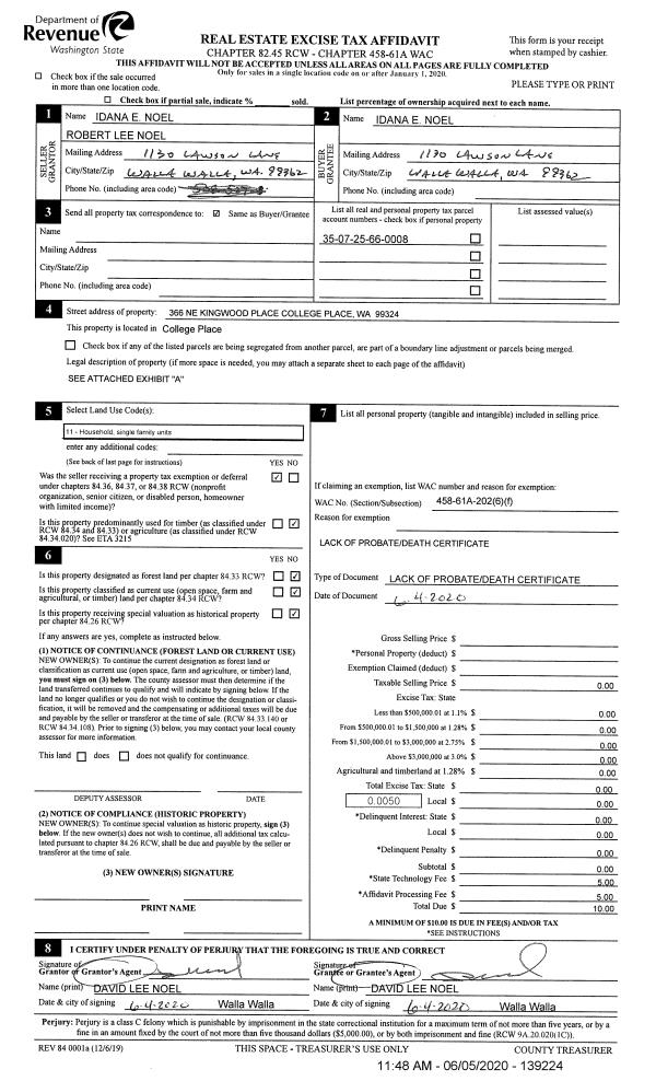 | 2 | 06/05/2020 | LOPA | LACK OF PROBATE AFFIDAVIT | NOEL IDANA ELIZABETH | NOEL IDANA ELIZABETH | | | $0.00 | 139224 | 2020-05020 |