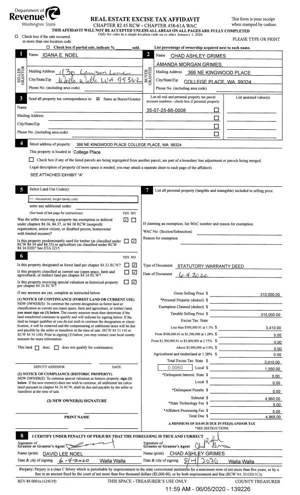 | 1 | 06/05/2020 | SWD | STATUTORY WARRANTY DEED | NOEL IDANA ELIZABETH | GRIMES CHAD ASHLEY & AMANDA MORGAN | | | $310,000.00 | 139226 | 2020-05021 |