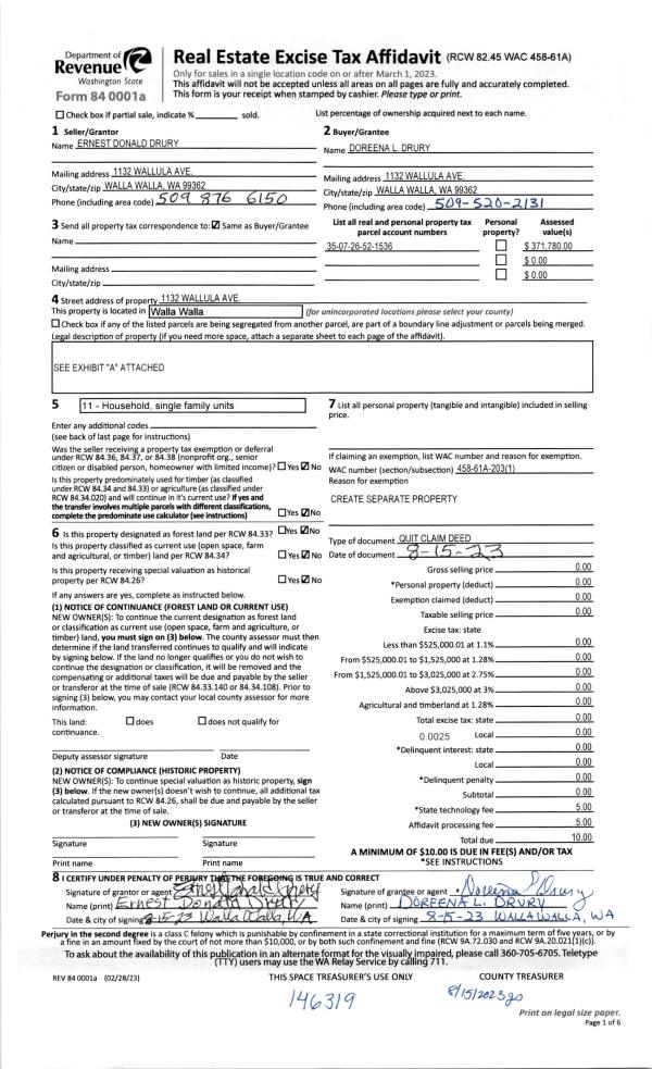 | 1 | 08/15/2023 | QCD | QUIT CLAIM DEED | DRURY ERNEST DONALD & DOREENA L | DRURY DOREENA L | | | | 146319 | 2023-04707 |