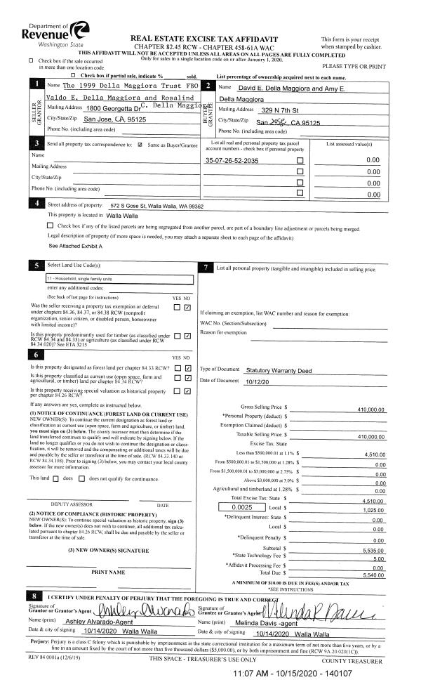 | 1 | 10/15/2020 | SWD | STATUTORY WARRANTY DEED | DELLA MAGGIORA TRUST FBO | DELLA MAGGIORA DAVID E & AMY E | | | $410,000.00 | 140107 | 2020-10667 |