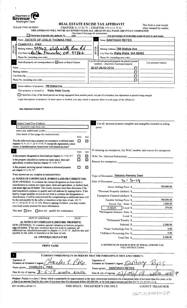 | 1 | 03/05/2019 | SWD | STATUTORY WARRANTY DEED | PIKE LESLIE THOMAS ESTATE OF | REYES SANTIAGO | | | $150,000.00 | 136471 | 2019-01436 |