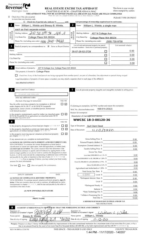 | 1 | 11/17/2020 | QCD | QUIT CLAIM DEED | WINKLE WILLIAM L & BREEZY B | WINKLE WILLIAM L | | | | 140357 | 2020-12145 |