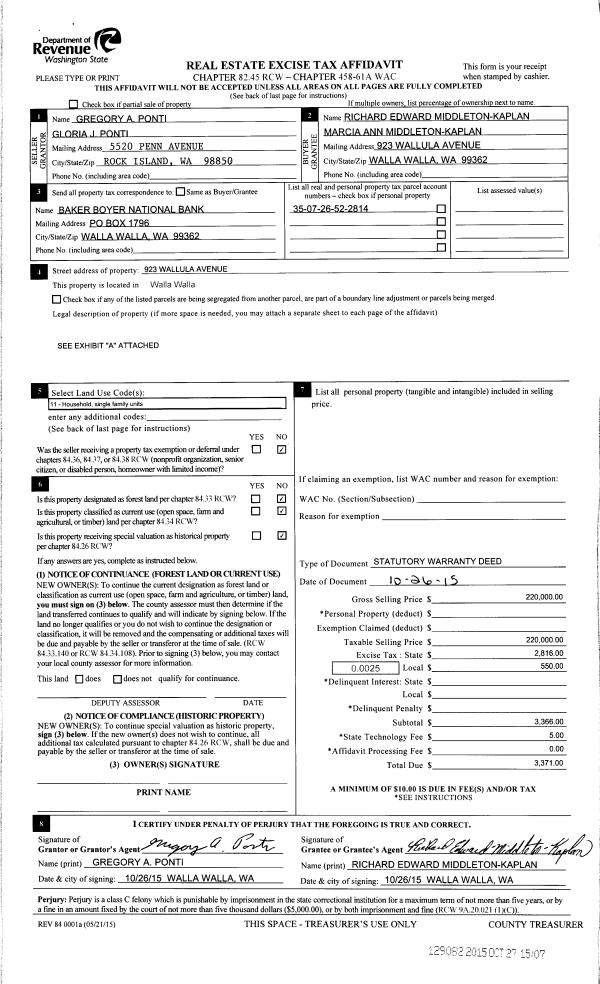 | Mailing Address: | MARCIA ANN MIDDLETON-KAPLAN 923 WALLULA AVE WALLA WALLA, WA 99362 | % Ownership: | 100.0000000000% |