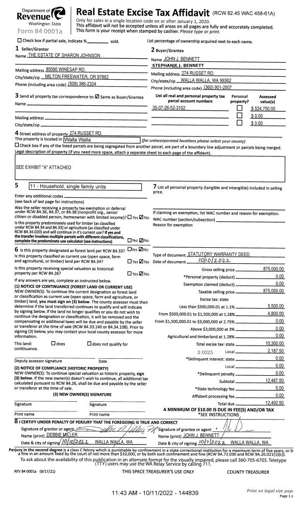 | 1 | 10/11/2022 | SWD | STATUTORY WARRANTY DEED | JOHNSON SHARON ESTATE OF | BENNETT JOHN J & STEPHANIE J | | | $875,000.00 | 144839 | 2022-08349 |
