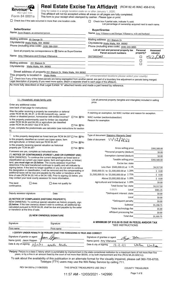 | 2 | 12/03/2021 | SWD | STATUTORY WARRANTY DEED | HOPPEN JASON | VILLANUEVA AMY & ENRIQUE | | | $392,500.00 | 142990 | 2021-14284 |