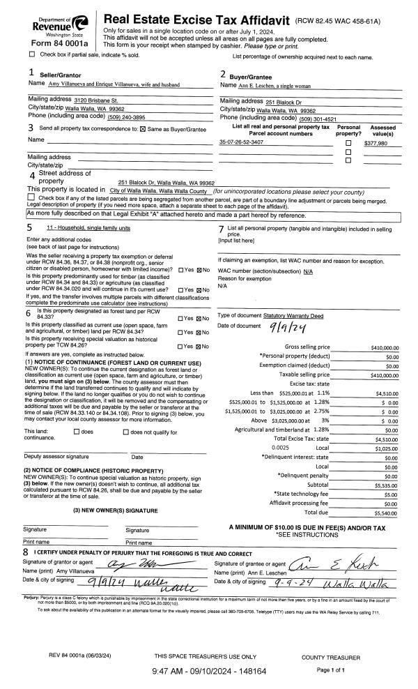 | 1 | 09/10/2024 | SWD | STATUTORY WARRANTY DEED | VILLANUEVA AMY & ENRIQUE | LESCHEN ANN E | | | $410,000.00 | 148164 | 2024-05113 |