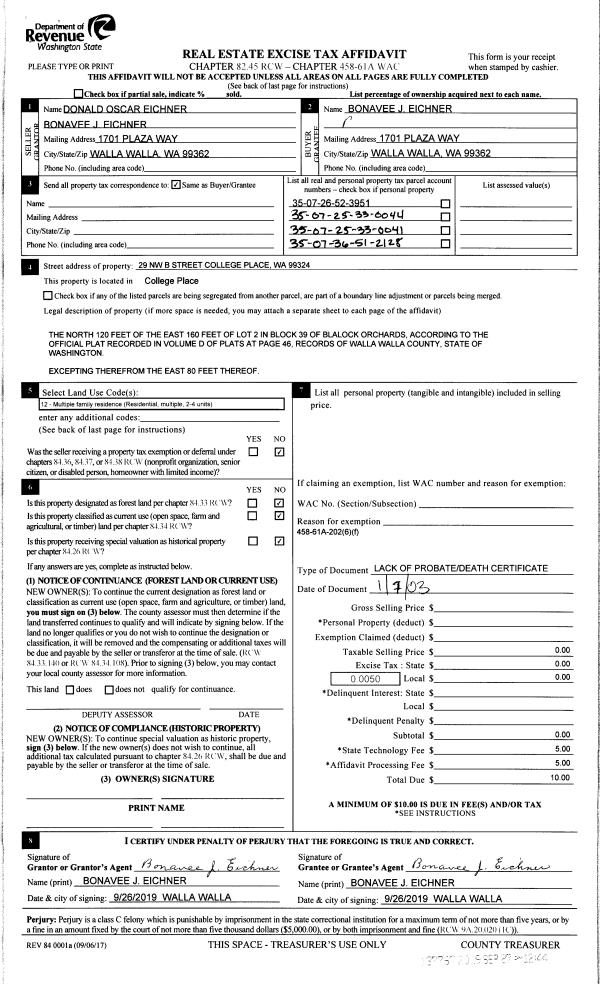 | 3 | 09/26/2019 | LOPA | LACK OF PROBATE AFFIDAVIT | EICHNER DONALD O & BONAVEE J | EICHNER BONAVEE J | | | $0.00 | 137767 | SEE IMAGES |