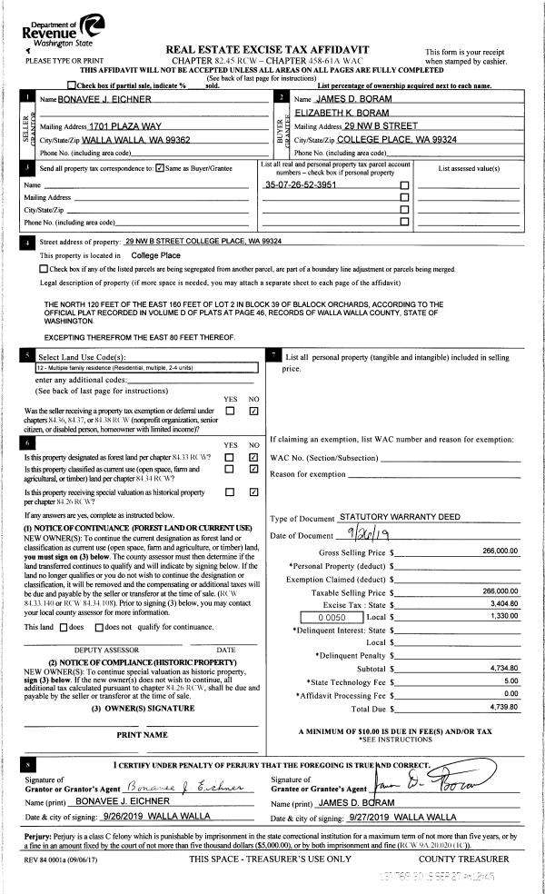 | 1 | 09/27/2019 | SWD | STATUTORY WARRANTY DEED | EICHNER BONAVEE J | BORAM JAMES D & ELIZABETH K | | | $266,000.00 | 137769 | 2019-07671 |