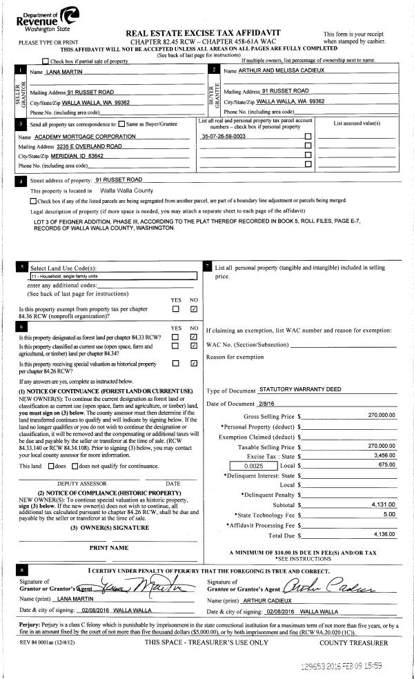 | 1 | 02/09/2016 | SWD | STATUTORY WARRANTY DEED | MARTIN LANA | CADIEUX ARTHUR & MELISSA | | | $270,000.00 | 129653 | 2016-01012 |