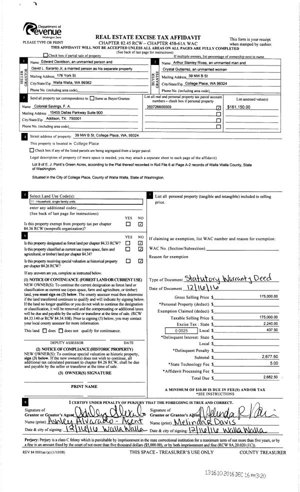 | 3 | 12/16/2016 | SWD | STATUTORY WARRANTY DEED | DAVIDSON EDWARD | RIVAS ARTHUR STANLEY | | | $175,000.00 | 131610 | 2016-10378 |