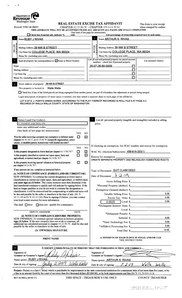 | 1 | 07/02/2019 | QCD | QUIT CLAIM DEED | RIVAS RUBY J | RIVAS ARTHUR S | | | $0.00 | 137228 | 2019-04847 |