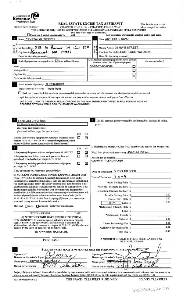 | 2 | 07/05/2019 | QCD | QUIT CLAIM DEED | RIVAS ARTHUR STANLEY | RIVAS ARTHUR S | | | $0.00 | 137229 | 2019-04848 |