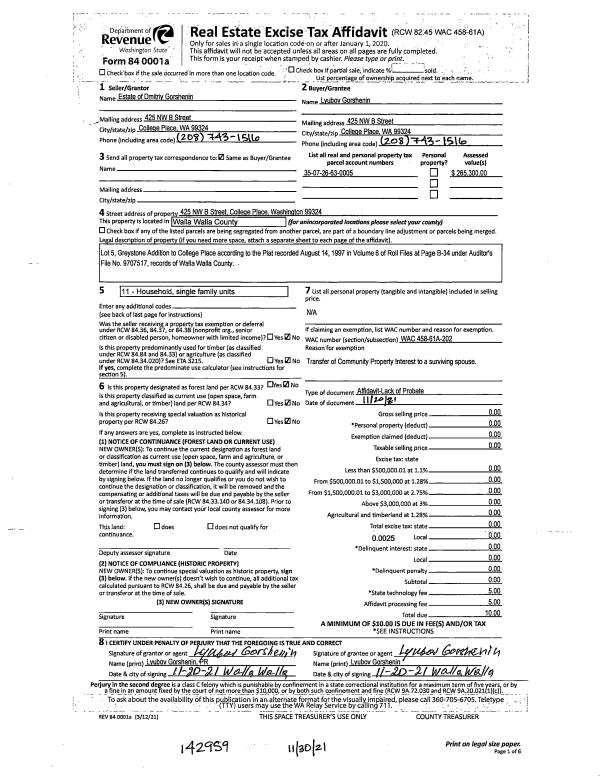| 1 | 11/30/2021 | LOPA | LACK OF PROBATE AFFIDAVIT | GORSHENIN DMITRIY & LYUBOV | GORSHENIN LYUBOV | | | $0.00 | 142959 | 2021-14125 |