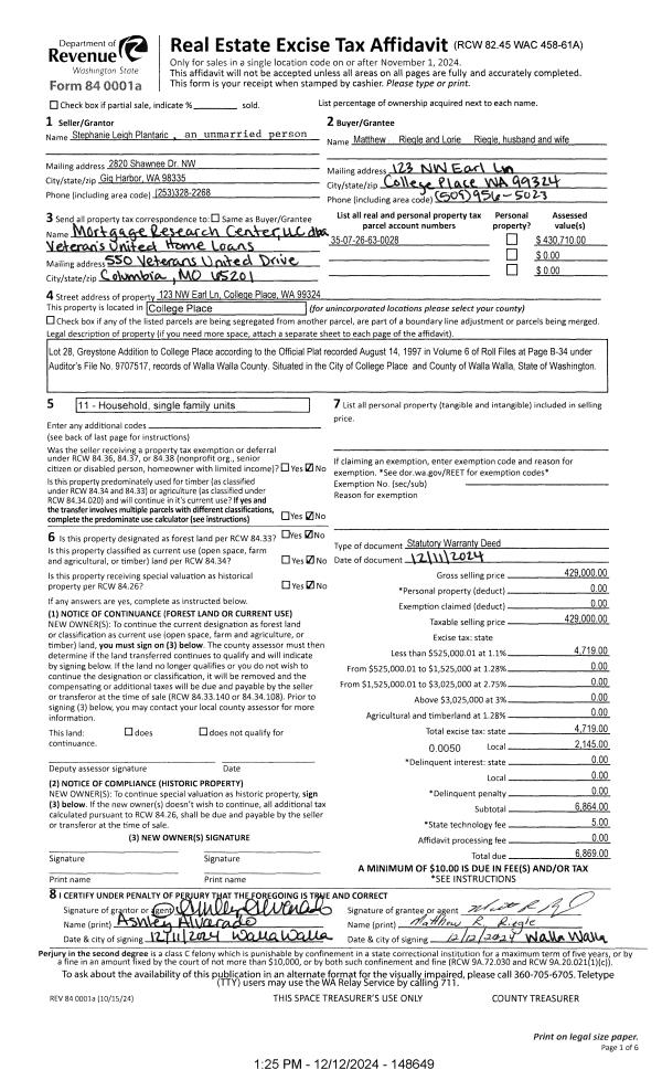 | 1 | 12/12/2024 | SWD | STATUTORY WARRANTY DEED | PLANTARIC STEPHANIE LEIGH | RIEGLE MATTHEW & LORIE | | | $429,000.00 | 148649 | 2024-07185 |
