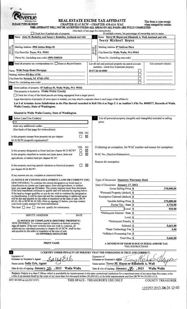 | 2 | 01/24/2013 | WARRANTY D | WARRANTY DEED | ROSKELLEY, JOHN M & SUSAN I | HAYES, TERRY MICHAEL | | | $370,000.00 | 123372 | 2013-00696 |