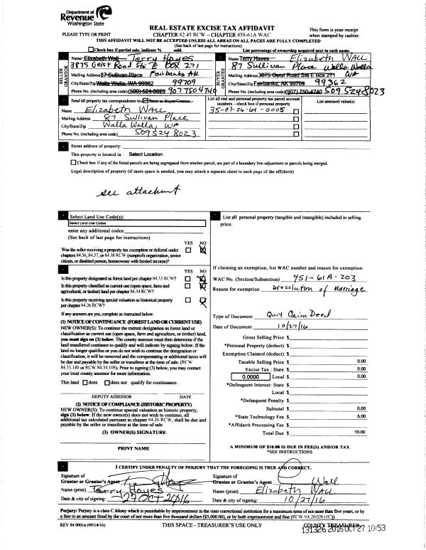 | 1 | 10/27/2016 | QCD | QUIT CLAIM DEED | HAYES TERRY MICHAEL | WALL ELIZABETH A | | | | 131326 | 2016-08906 |