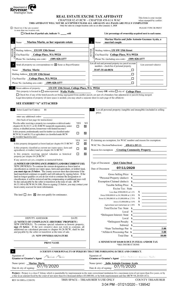 | 1 | 07/21/2020 | QCD | QUIT CLAIM DEED | MARIN MARINA | MARIN MARINA & JULIO ANTONIO GUZMAN AYALA | | | | 139542 | 2020-07041 |