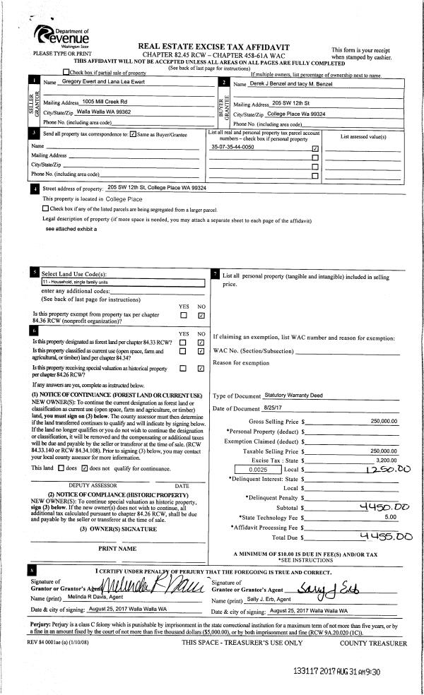 | 1 | 08/31/2017 | SWD | STATUTORY WARRANTY DEED | EWERT GREGORY B | BENZEL DEREK J & TACY M | | | $250,000.00 | 133117 | 2017-06812 |