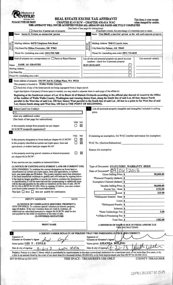 | 3 | 10/02/2013 | WARRANTY D | WARRANTY DEED | CEXTON, AARON G | BILOFF, CHET | | | $90,000.00 | 124761 | 2013-10023 |