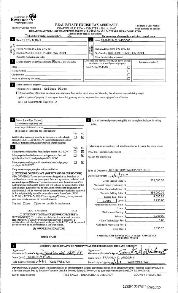| 1 | 10/12/2017 | SWD | STATUTORY WARRANTY DEED | BALL EILEEN ESTATE OF | WISDOM FRANKLIN D II | | | $359,000.00 | 133390 | 2017-08098 |