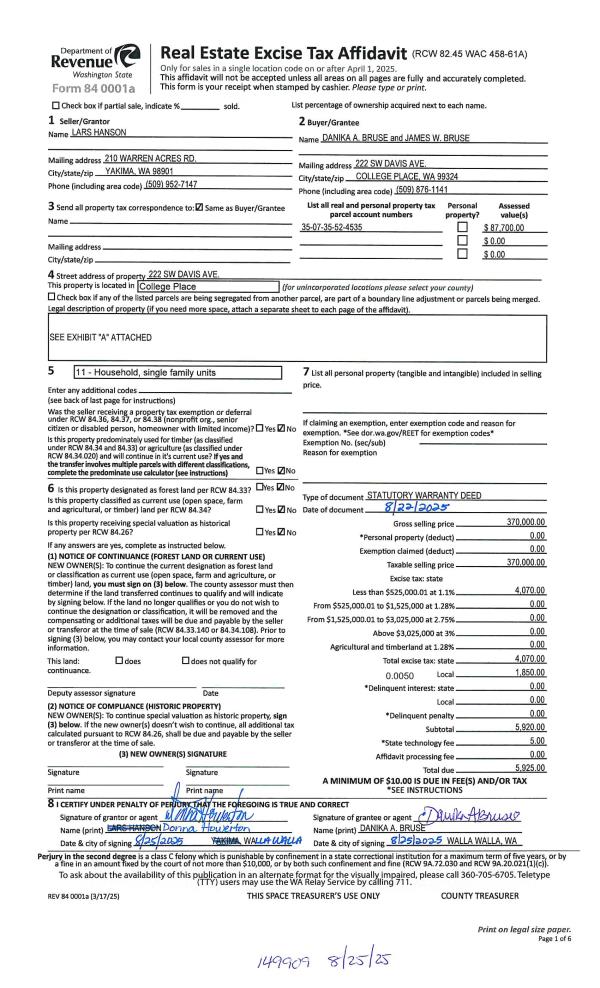 | 1 | 08/25/2025 | SWD | STATUTORY WARRANTY DEED | HANSON LARS | BRUSE DANIKA A & JAMES W | | | $370,000.00 | 149909 | 2025-05081 |
