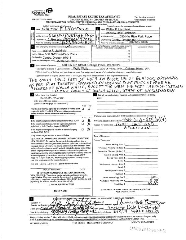 | 3 | 08/08/2019 | QCD | QUIT CLAIM DEED | LITCHFIELD WALTER F ESTATE OF | LITCHFIELD ANDREW DALE | | | $0.00 | 137439 | 2019-05869 |