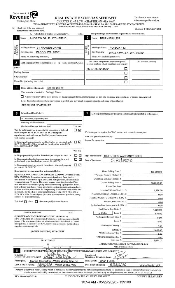 | 2 | 05/29/2020 | SWD | STATUTORY WARRANTY DEED | LITCHFIELD ANDREW DALE | FULLEN BRIAN | | | $166,000.00 | 139180 | 2020-04753 |