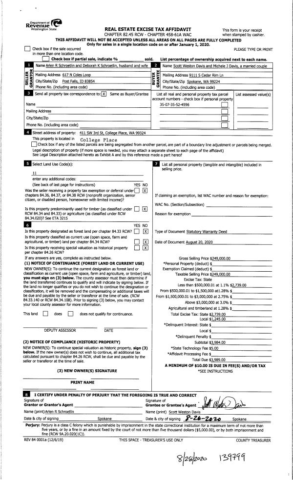 | 1 | 08/28/2020 | SWD | STATUTORY WARRANTY DEED | SCHROETLIN ARLEN R & DEBORAH K | DAVIS SCOTT WESTON & MICHELE J | | | $249,000.00 | 139799 | 2020-08689 |