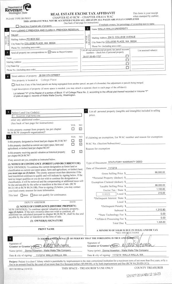 | 1 | 11/12/2014 | SWD | STATUTORY WARRANTY DEED | PREHODA LUDWIG & CLARA | WALLA WALLA UNIVERSITY | | | $86,000.00 | 126927 | 2014-08238 |