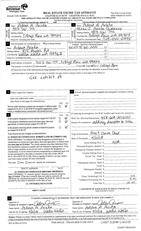 | Mailing Address: | ALEXA J ARIETA-DUNLEAVY 503 SW 7TH ST COLLEGE PLACE, WA 99324 | % Ownership: | 100.0000000000% |