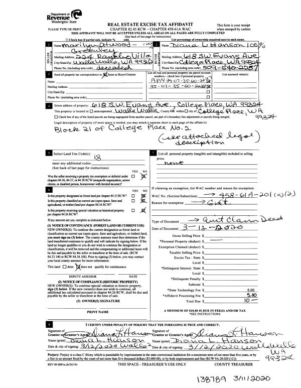 | 1 | 03/12/2020 | QCD | QUIT CLAIM DEED | GREENLEY BILL | HANSON DIANA L | | | $0.00 | 138789 | 2020-02361 |